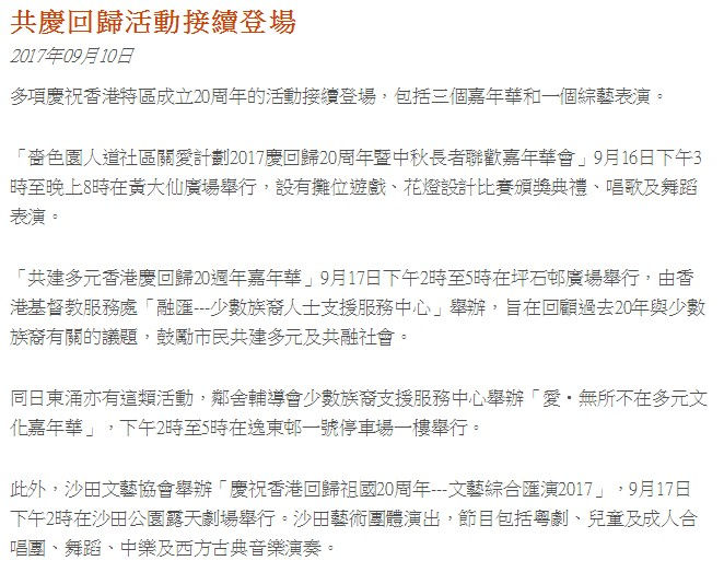 嗇色園人道社區關愛計劃2017慶回歸20周年暨中秋長者聯歡嘉年華會 -- 9月16日下午3時至晚上8時在黃大仙廣場舉行